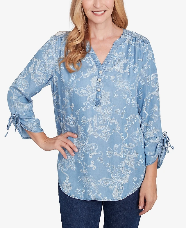 Alfred Dunner Petite Classics Super Soft Scroll V-Neck Henley Top