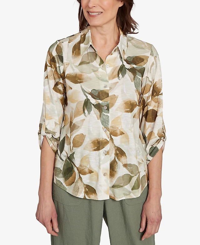 Alfred Dunner Petite Copper Canyon Knit Leaf Button Front Collared Top