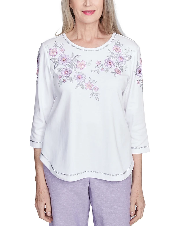 Alfred Dunner Petite Crystal Springs Embroidered Flower Crew Neck Top