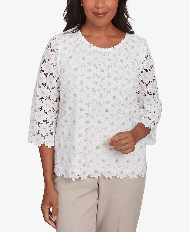 Alfred Dunner Petite Kensington Gardens Daisy Woven Lace Crew Neck Top