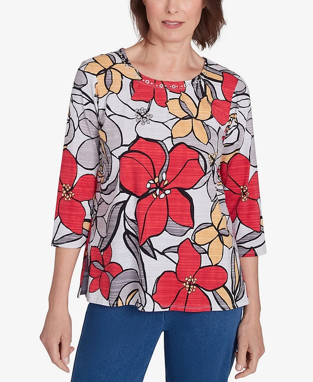 Alfred Dunner Women's Floral Asymmetric Three Quarter Sleeve Top