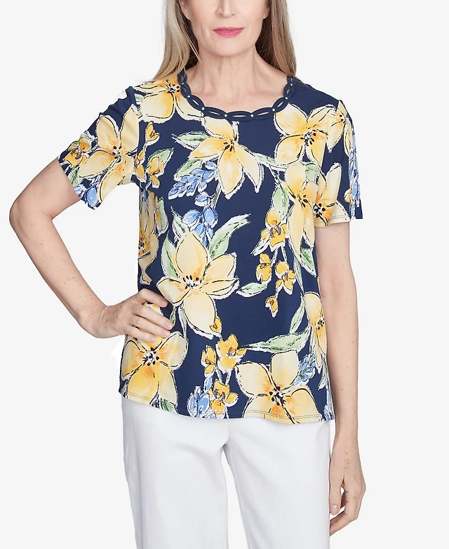 Alfred Dunner Petite Navy Floral Braided Crew Neck Top