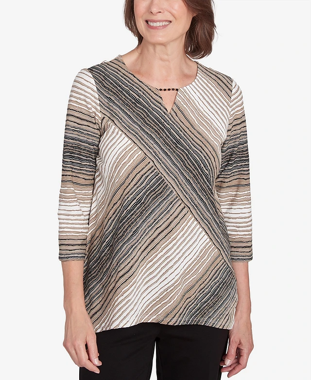 Alfred Dunner Petite Neutral Spliced Textured Stripe Top