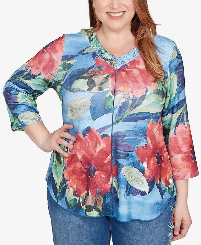 Alfred Dunner Plus Caribbean Blues Monotone Dramatic Floral Tropical Top