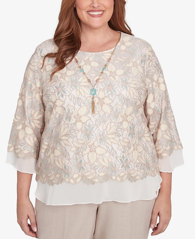 Alfred Dunner Plus Kensington Gardens Floral Lace Woven Trim Top with Necklace