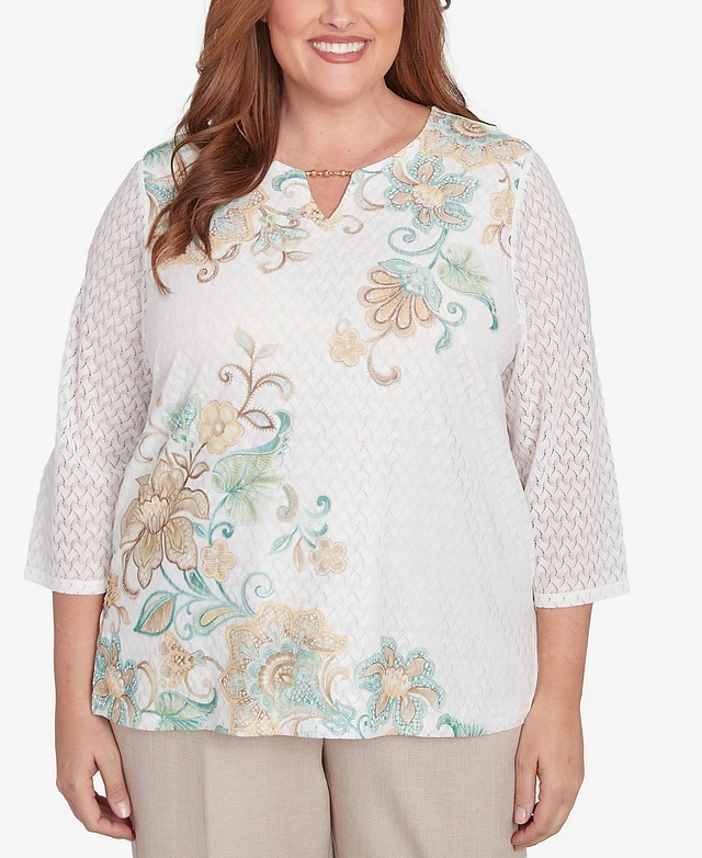 Alfred Dunner Plus Kensington Gardens Textured Knit Scroll Split Neck Top