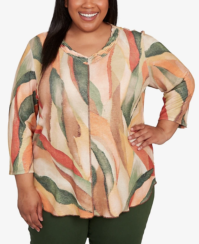 Alfred Dunner Plus Size Mount Laurel Abstract Leaf Sharkbite Hem Pull On Top with Necklace