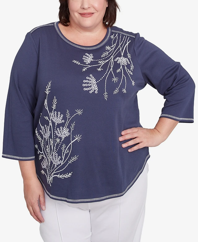 Alfred Dunner Plus Size Nantucket Asymmetric Floral Embroidered Top