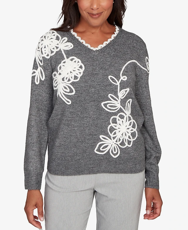 Alfred Dunner Plus Size Stockbridge Ruffle V-Neck Floral Soutache Sweater
