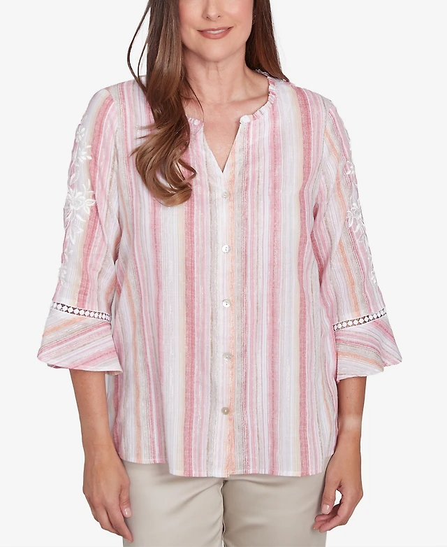 Alfred Dunner Women's Coming Up Roses Striped Button Down Embroidered Sleeve Top
