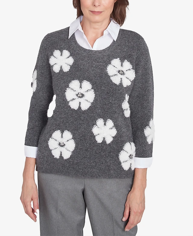 Alfred Dunner Women's Copenhagen Floral Collared Two in One Sweater