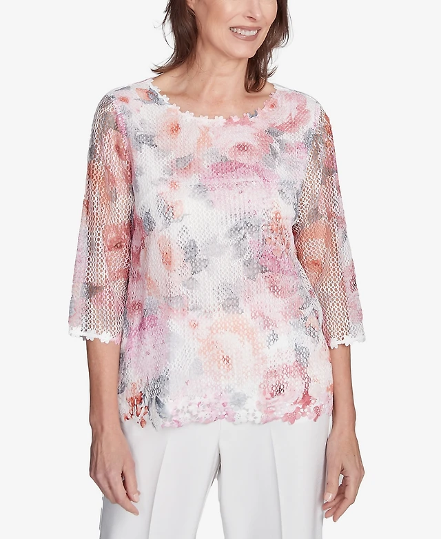 Alfred Dunner Women's Estate of Mind Floral Mesh Watercolor Top