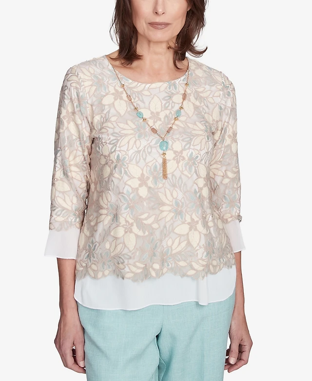 Alfred Dunner Women's Dress Code Two in One Lace Top with Necklace