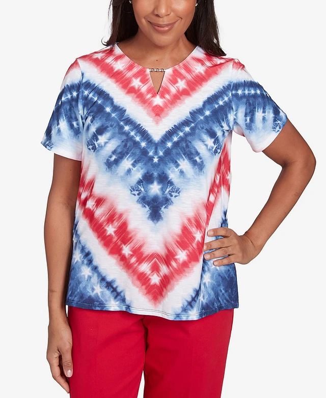 Alfred Dunner Women's Land of The Free Tie Dye American Chevron Keyhole Neck T-Shirt