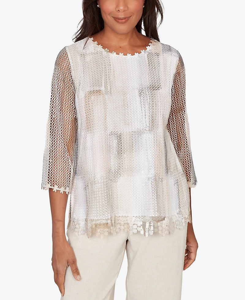 Alfred Dunner Women's Natural Wonder Neutral Brushstrokes Mesh Top