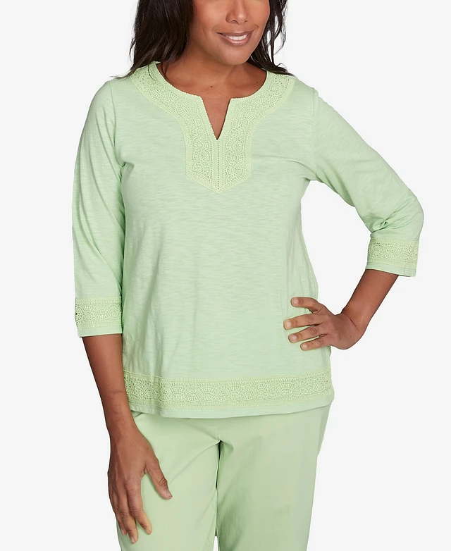 Alfred Dunner Women's Parrot Cay Solid Split Neck Lace Trim Top