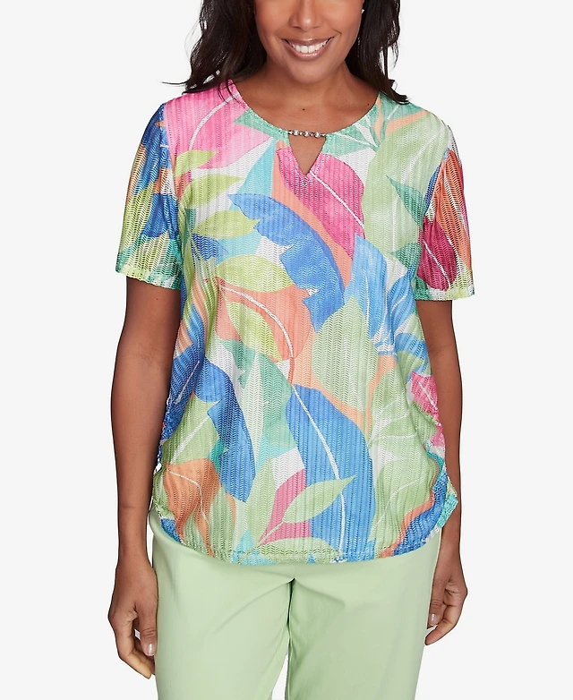 Alfred Dunner Women's Parrot Cay Textured Tropical Beaded Neck Top