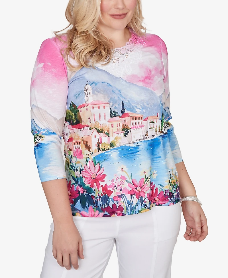 A scenic illustration of Lake Como brings dreamy beauty to this three-quarter sleeve, lace-trimmed crew neck top. With a straight hemline and soft drape, it turns a simple silhouette into a gentle escape.