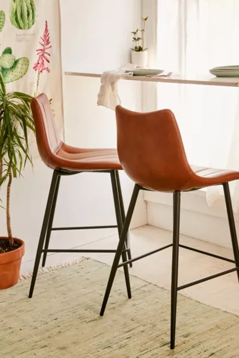Set of 2 faux leather-upholstered counter stools. Sloping silhouette provides a comfortable seat with seamed construction, angular metal legs and footrest wrapping around.