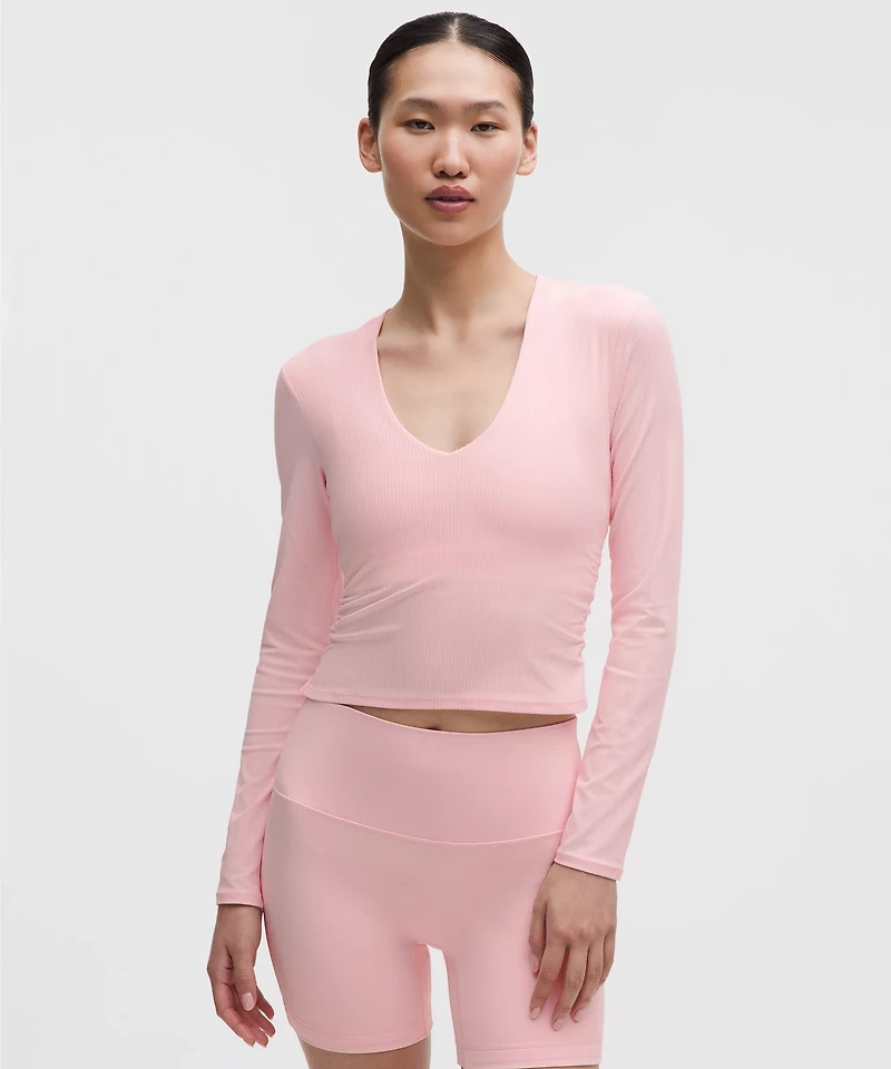 Performance meets elegance in this v-neck long sleeve. Buttery-soft fabric moves with you, a built-in shelf gives gentle support, and cinched sides contour your curves.