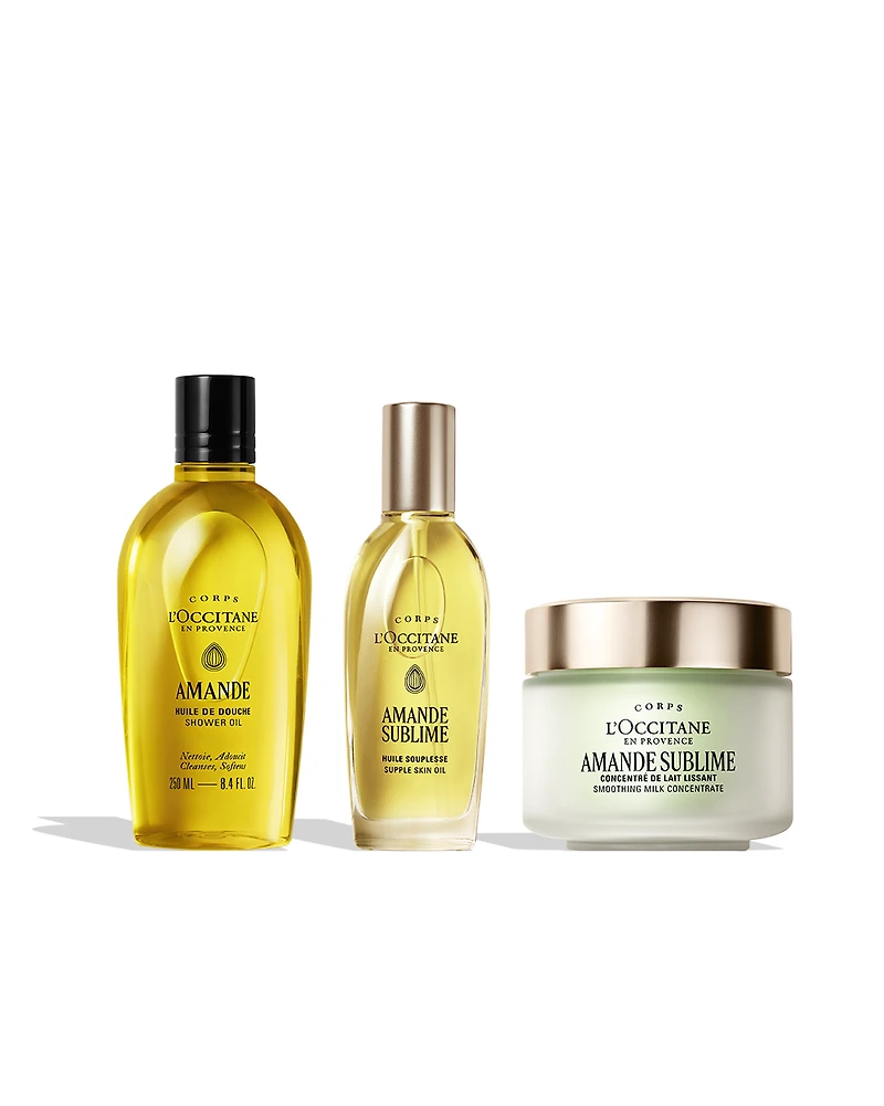 Set Includes: Amande Shower Oil 250ml/8.4 fl oz: Masterfully crafted with 30% of botanical oils, this indulgent shower oil gently cleanses while visibly moisturizing the skin in a single step. Upon contact with water, its rich texture transforms into a delicate, milky lather, leaving your skin feeling soft, supple, and beautifully silky. Amande Milk Concentrate 200 ml/ 6.8 fl oz: Delivers 48h long-lasting hydration* while enhancing your skin’s glow, designed to help smooth and visibly firm, it leaves skin feeling soft, supple, and visibly radiant. Amande Supple Skin Oil 100ml/ 3.4 fl oz: Enhances skin elasticity while visibly improving the appearance of stretch marks. Its lightweight, silky texture absorbs effortlessly, leaving your skin feeling smoother, firmer, and beautifully radiant. *Efficacy test on 11 volunteers