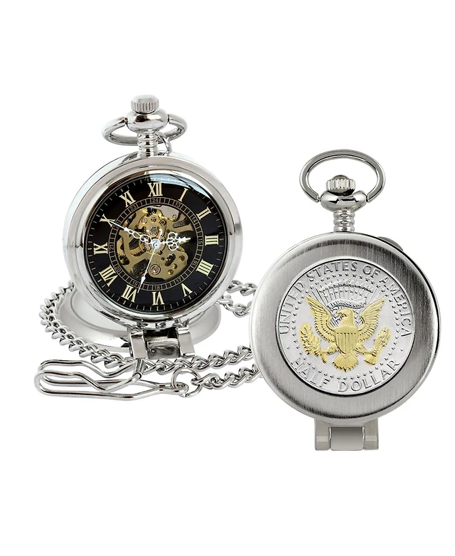 American Coin Treasures 16269 Selectively Gold-Layered Presidential Seal Jfk Half Dollar Coin Pocket Watch with Skeleton Movement, Black Dial with Gol