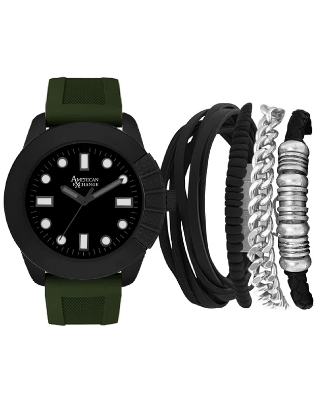 American Exchange Men's Olive Silicone Strap Analog Watch 48mm with Stackable Bracelets Gift Set