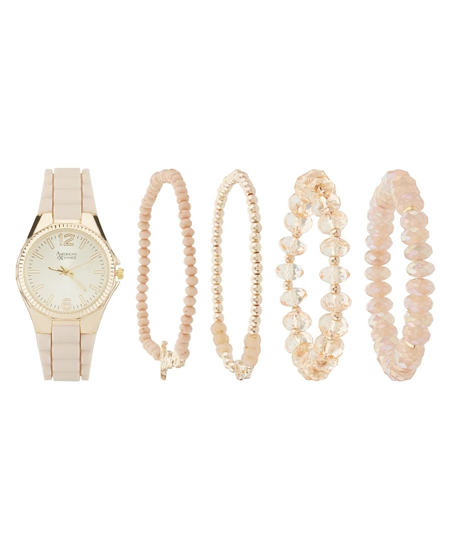 American Exchange Women's Beige Silicone Strap Analog Watch 35mm with Stackable Bracelets Gift Set