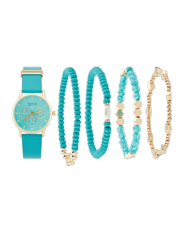 American Exchange Women's Turquoise Polyurethane Leather Strap Analog Watch 32mm with Stackable Bracelets Gift Set