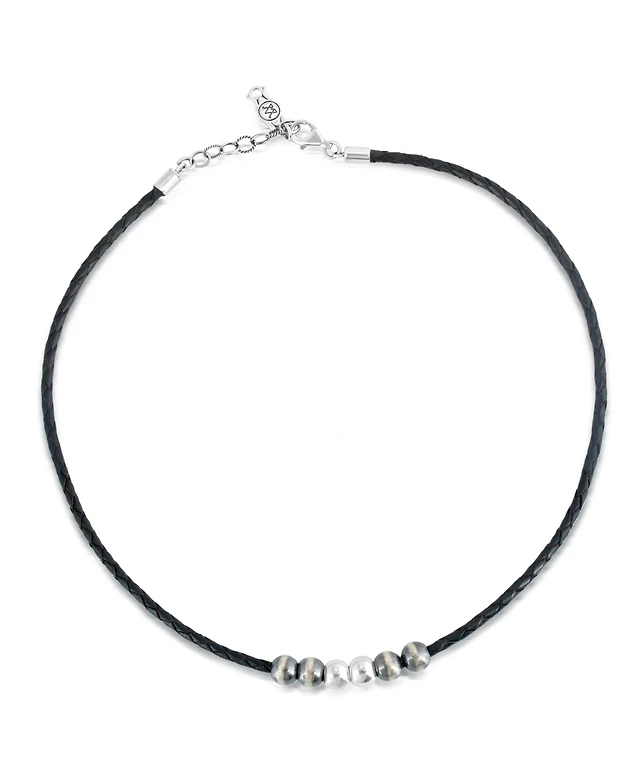 American West Jewelry Sterling Silver Braided Black Genuine Leather Beaded Necklace 20 to 22 Inches