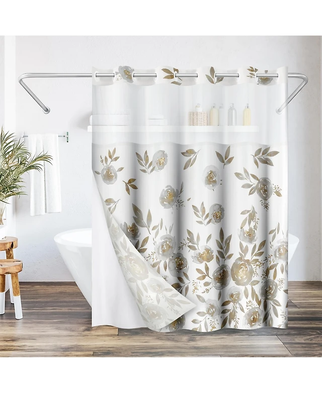 Americanflat 72x75 Hookless Shower Curtain - Floral Gold Grey Shower Curtain with Sheer Panel, Snap-In Liner, and Grommets - 100% Polyester