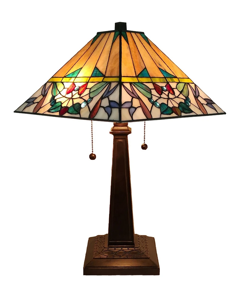 With warm tones and classic lines, this amora lighting table lamp is a beautiful mission-style piece featuring multi-color, geometric patterns throughout the glass. This tiffany style lamp is handcrafted using the same techniques that were developed by Louis comfort tiffany in the early 1900s.