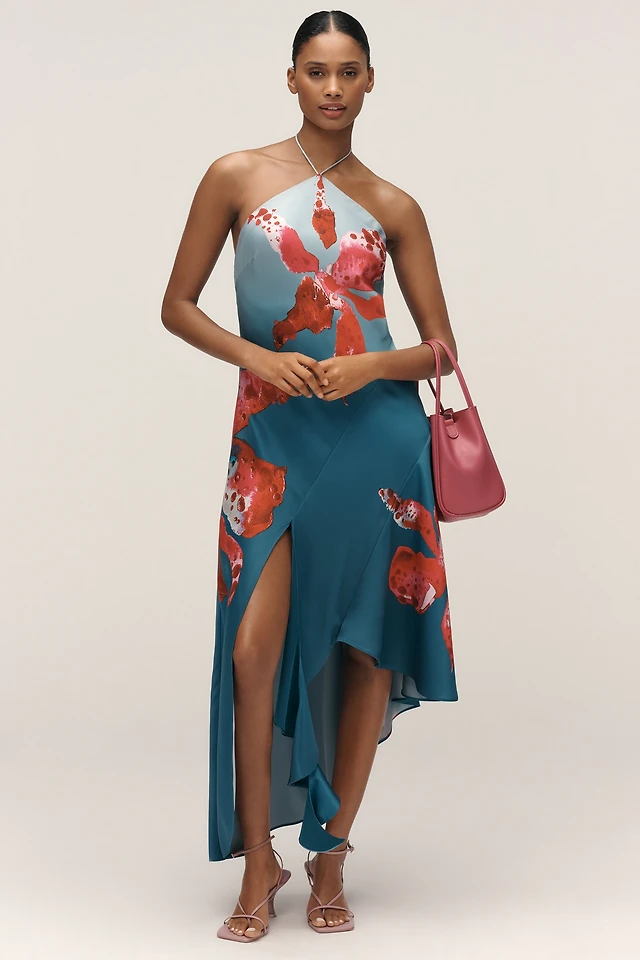 AMUR Alohi Halter Asymmetric Slip Midi Dress