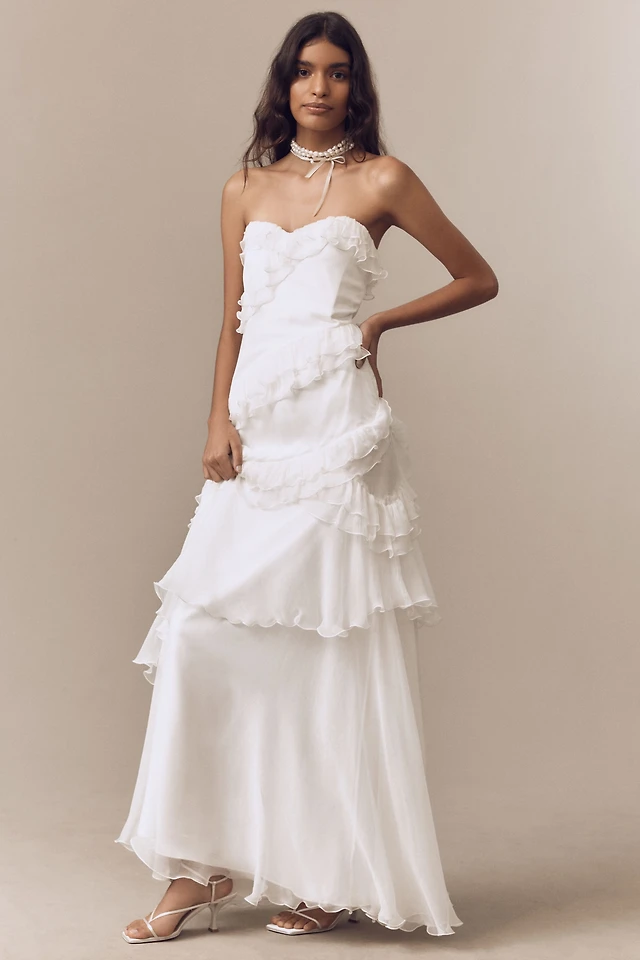 Mac Duggal Women's Pleated Charmeuse Strapless Tiered Ruffle Gown