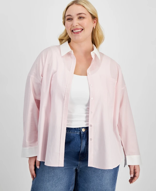 And Now This Trendy Plus Size Cotton Striped Contrast Shirt, Exclusively at Macy's