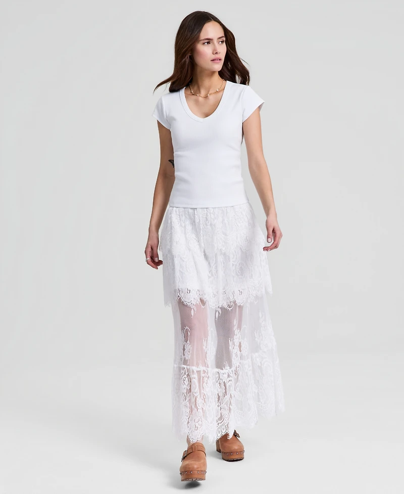 And Now This plays with length and lace on this tiered maxi skirt. Semi sheer below the thigh, it has an illusion effect that makes your looks that much more fun.