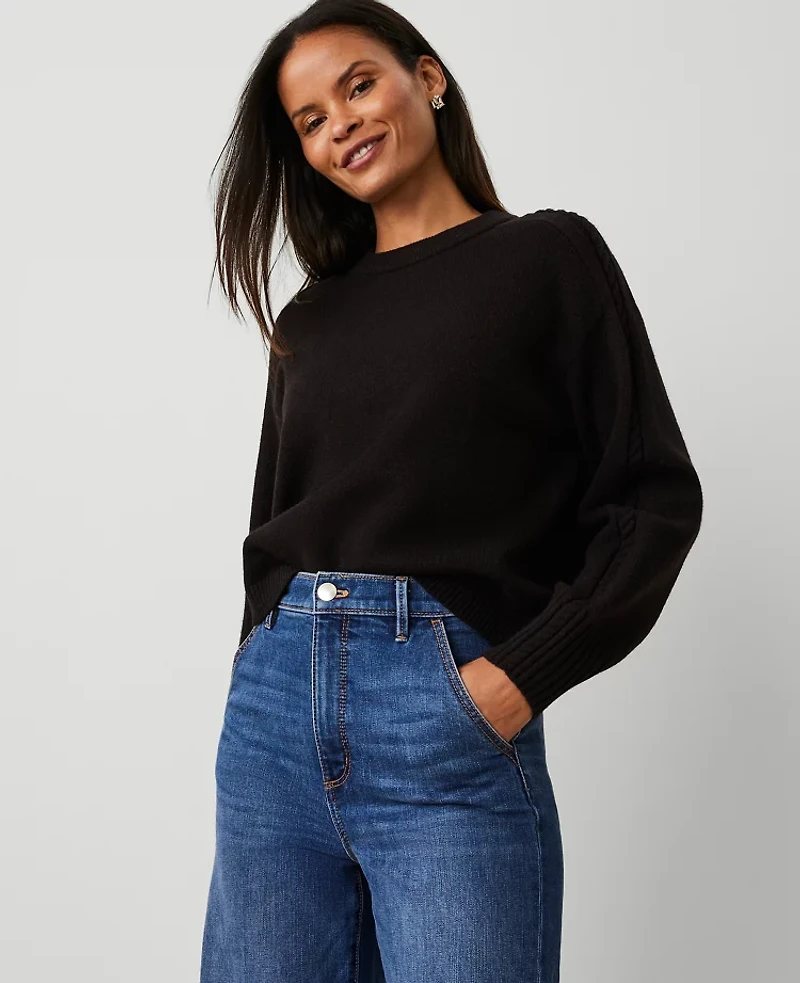 Cast with cozy cable detail, this relaxed crew neck is the quintessential wear - with anything sweater. Crew neck Long sleeves Drop shoulders Ribbed neckline, cuffs and hem., Imported:, Fit: Softly fitted, Length: 22"long, Fabrication: 54% Acrylic, 30% Polyester, 16% Nylon, Garment Care: Machine Washable Cable Sweater by Ann Taylor Size Classic - XS Black Women's Texture, Crew Neck Long Sleeve Pullover Sweaters 54% Acrylic 30% Polyester 16% Nylon Machine Washable Best Fall Sweaters