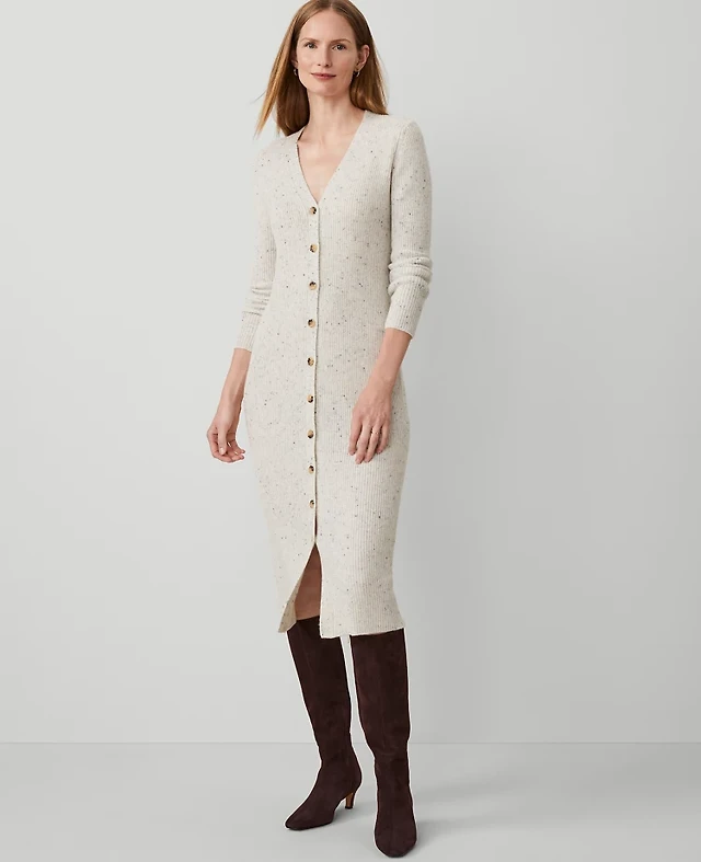 Ann Taylor Cashmere Ribbed Cardigan Dress Size Large Cream Speckle Women's