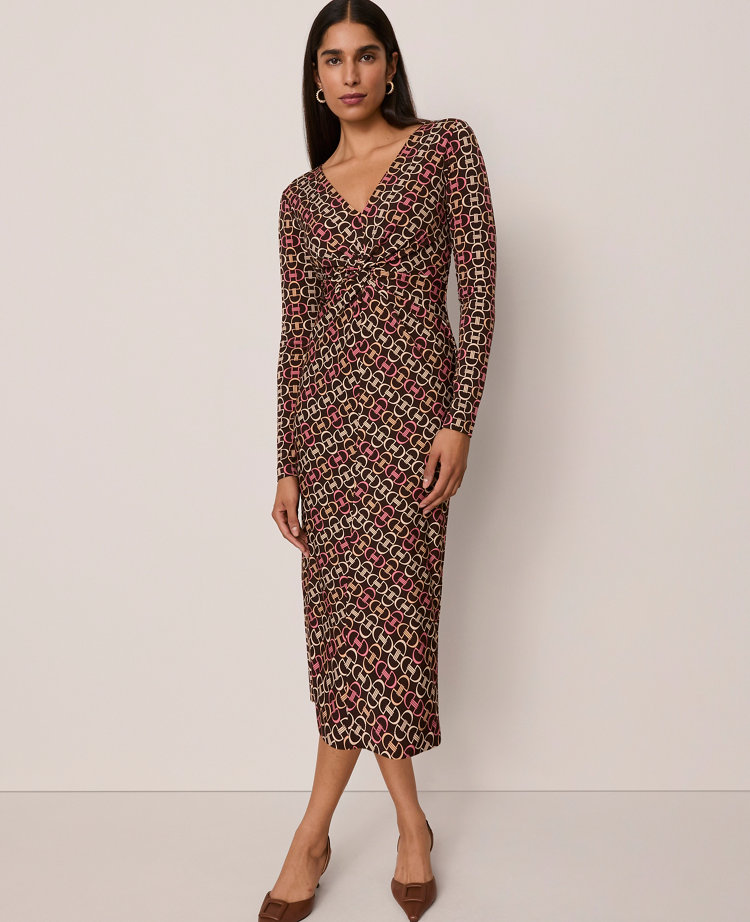 This impeccably cut knit column dress is gathered at the waist for an artful twist on a flattering style. V - neck. Long sleeves Back zip closure. Lined, Hit: Hits at mid - calf, Imported:, Length: 32"from natural waist, Fabrication: Shell 92% Polyester, 8% Spandex; Lining: 100% Polyester, Garment Care: Machine Washable Chain Link V - Neck Knit Dress by Ann Taylor Size Classic - 8 Pure Chocolate Women's Sheath, Regular V - Neck, Long Sleeve Dresses Shell 92%, Polyester 8% Spandex Lining 100%, Polyester Machine Washable