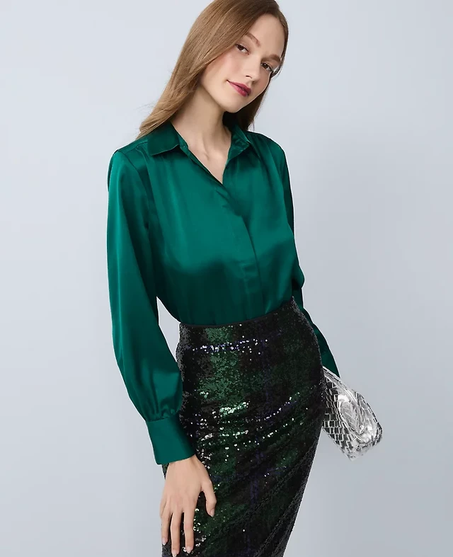 Ann Taylor Collared Satin Blouse Size XL Black Women's