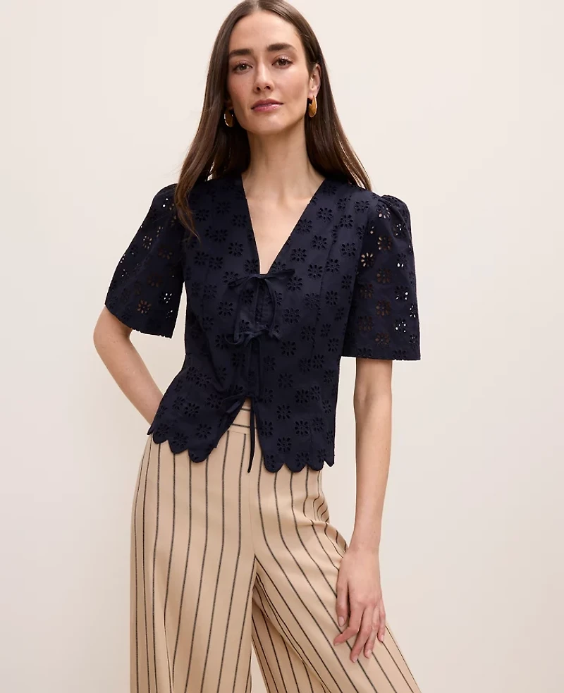 Done in romantic eyelet, this cotton blouse is designed with a scalloped hem and a tie front for the perfect feminine touch. V - neck. Short sleeves Tie front Lined body, Bullet1: For heights 5'4"and below, try our petite fit., Imported:, Fit: Blousy our most relaxed fit, Length: 20 3/4"long, Fabrication: 100% Cotton, Garment Care: Machine Washable Eyelet Tie Front Blouse by Ann Taylor Size Classic - 0 Night Sky Women's 100%, Cotton Crew Neck Short Sleeve Blouse Tops 100% Cotton Machine Washable