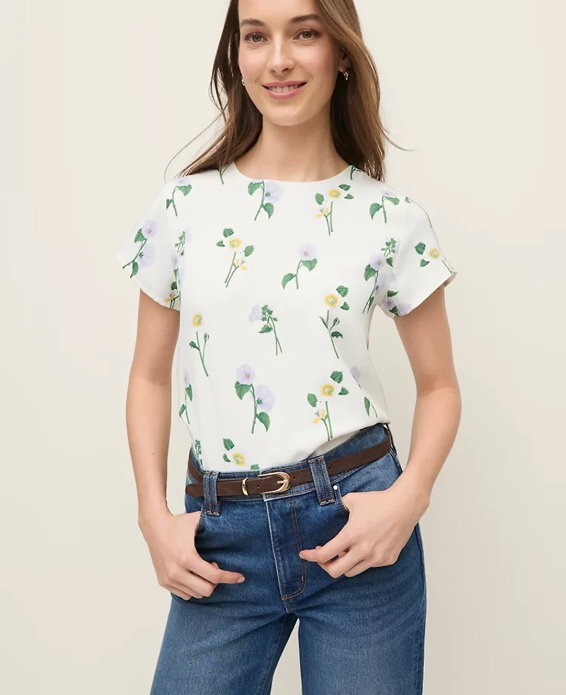 Ann Taylor Floral Mixed Media Crew Neck T-Shirt Winter White - Lilac Women's