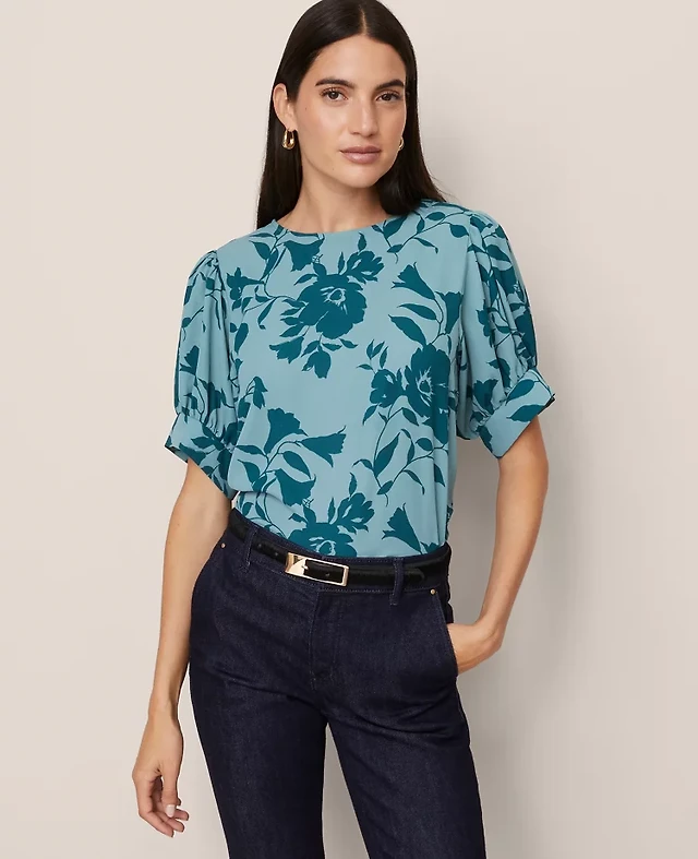 Ann Taylor Floral Mixed Media Gathered Sleeve Top Size Small Deep Atlantic Teal Women's