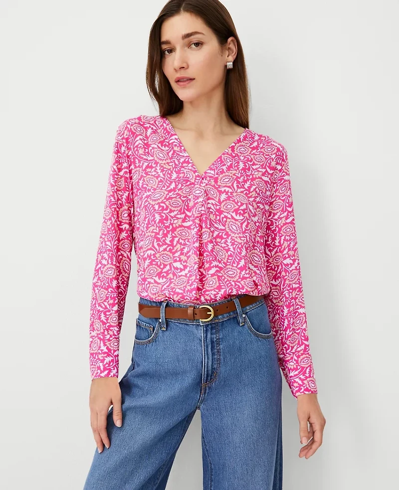 A clever pleated front adds extra ease and fluidity to this knit and woven essential. V - neck with pleat below. Long sleeves with button cuffs. Shirttail hem Woven front and sleeves. Knit back, Imported:, Fit: Relaxed fit, Length: 27"front length; 26 1/2"back length, Fabrication: Body 100% Polyester; Back Panel: 95% Polyester, 5% Spandex, Garment Care: Machine Washable Floral Mixed Media Pleat Front Top by Ann Taylor Size Classic - Small Bold Pink Women's V - Neck, Long Sleeve Blouse Tops Body 100%, Polyester Back Panel 95%, Polyester 5% Spandex Machine Washable