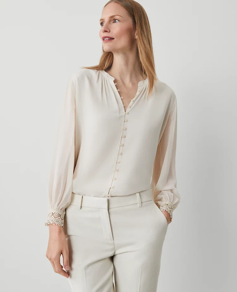 Ann Taylor Lace Cuff Mixed Media Top Sand Shell Women's