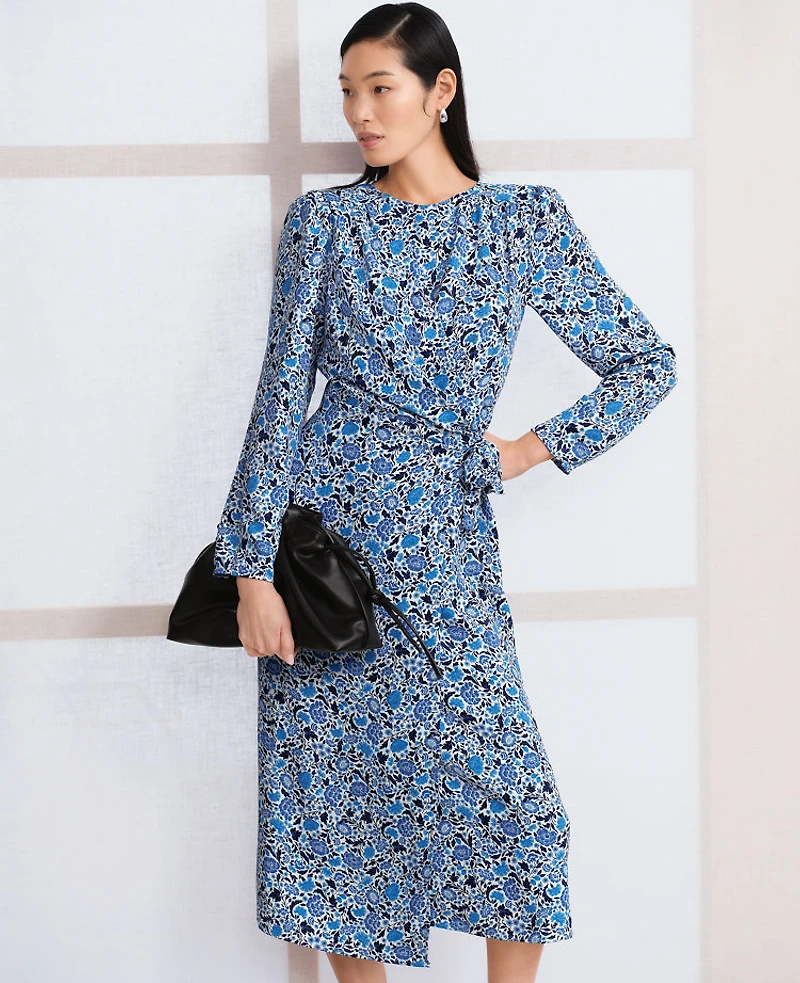 A beautifully draped wrap effect softens this sleek column dress with an elegant finish. Round neck Long sleeves with puff shoulders. Side waist ties. Back zip, Hit: Hits below the knee, Imported:, Length: 27 from natural waist, Fabrication: 100% Polyester, Garment Care: Machine Washable Petite Floral Column Midi Dress by Ann Taylor Size Petite - 10 Winter White Women's Sheath, Regular Crew Neck Long Sleeve Dresses 100% Polyester Machine Washable
