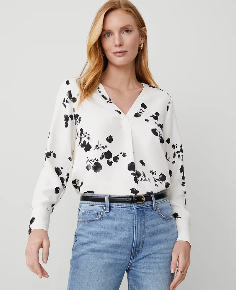 With a fluidly woven front and softly knit back, this flattering V - neck top is the best of both textural worlds. V - neck with pleat. Long blouson sleeves with button cuffs. Shirttail hem, Imported:, Length: 26 long, Fabrication: Body 100% Polyester; Back Panel: 92% Polyester, 8% Spandex, Garment Care: Machine Washable Petite Floral Mixed Media V - Neck Top by Ann Taylor Size Petite - 2XS Winter White - Black Women's V - Neck, Long Sleeve Blouse Tops Body 100%, Polyester Back Panel 92%, Polyester 8% Spandex Machine Washable