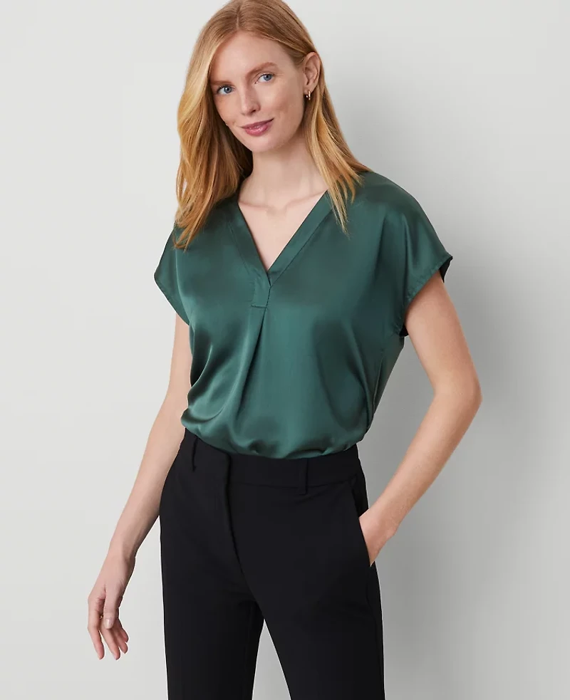 A clever pleated front adds extra ease and fluidity to this knit and woven essential. V - neck with pleat beneath. Short sleeves Woven front and sleeves. Knit back, Imported:, Length: 24 1/2 long, Fabrication: Front 100% Polyester; Back: 95% Polyester; 5% Spandex, Garment Care: Machine Washable Petite Mixed Media Pleat Front Top by Ann Taylor Size Petite - Small Dried Cilantro Women's V - Neck, Short Sleeve Blouse Tops Front 100%, Polyester Back 95%, Polyester 5%, Spandex Machine Washable