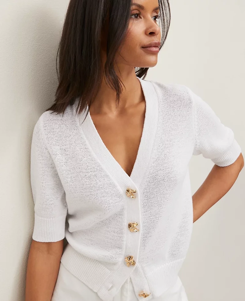 Punctuated with textured novelty buttons, this cotton - blend cardigan effortlessly elevates your wardrobe. V - neck. Short sleeves Button front, Imported:, Fit: Softly fitted, Length: 20 long, Fabrication: 71% Cotton, 29% nylon, Garment Care: Machine Washable Petite Novelty Button V - Neck Cardigan by Ann Taylor Size Petite - Small White Women's Cotton, Blend V - Neck, Short Sleeve Cardigan Sweaters 71% Cotton 29% nylon Machine Washable