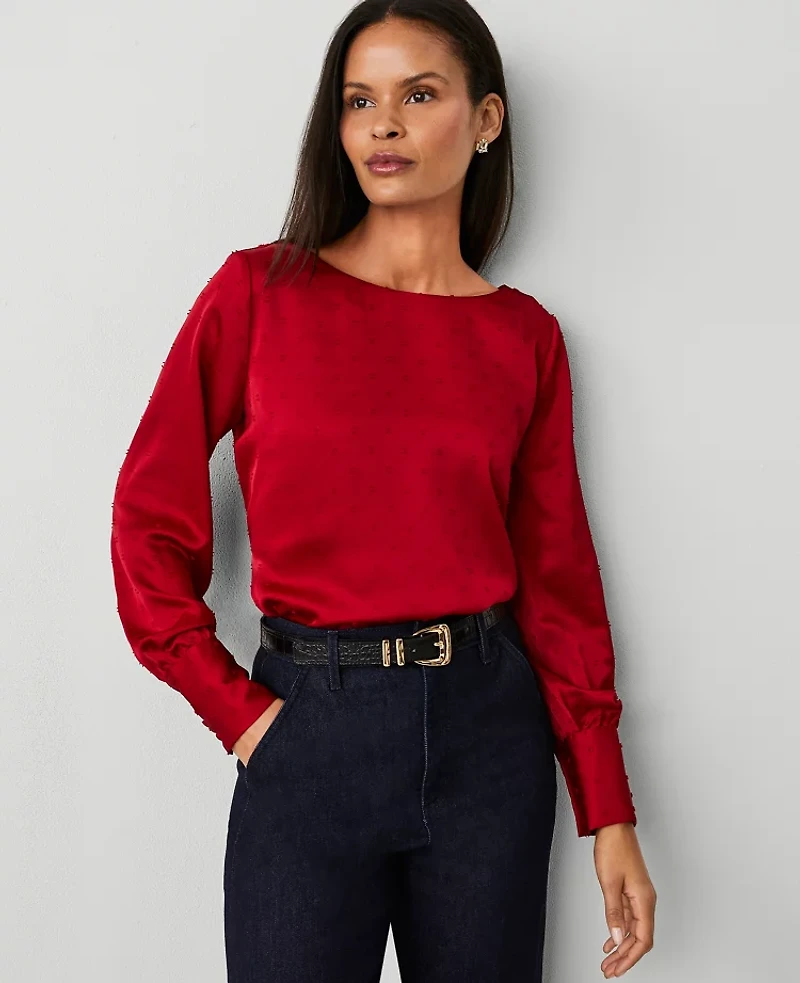 Elevate your everyday with this crew neck blouse, shirred at the sleeves for a flattering play of proportions. Long sleeves with button cuffs., Hit: Hits at hip, Imported:, Fit: Blousy our most relaxed fit, Length: 23 1/2"long, Fabrication: 100% Polyester, Garment Care: Machine Washable Petite Satin Clip Crew Neck Blouse by Ann Taylor Size Petite - 2XS Gingham Red Women's Boatneck, Long Sleeve Blouse Tops 100% Polyester Machine Washable
